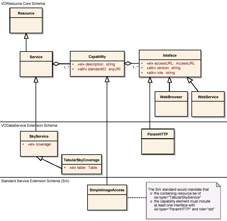 • The Service subclasses, SkyService and TabularSkyService, are retained to include descriptions of coverage and the tables engaged by the service. An SIA capability should be a part of a TabularSkyService.